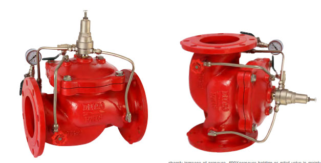 500Xpressure holding or relief valve is widely used in water pipeline of water supply and drainage, fire protection, power plants industry, it has the rapid response and release for pressure fluctuation, so as to prevent the damage to pipeline and equipment for the sharply increase of pressure. 500Xpressure holding or relief valve is mainly used for fire or other water supply systems, preventing the system overpressure or maintaining the pressure of fire fighting water supply system.The impact of water hammer can be reduced after fire pump is closed. It is also used in water hammer eliminating device of large water supply system. And there is a self-cleaning strainer at the inlet of valve control system, the properties of fluid make the suspended particles with larger proportion and diameter cannotenter the control system, thus ensuring the system circulation unobstructed, also making the pressure holding or relief valve run safely and reliably. The system action is smooth, it also has the advantages of high strength and long service life.